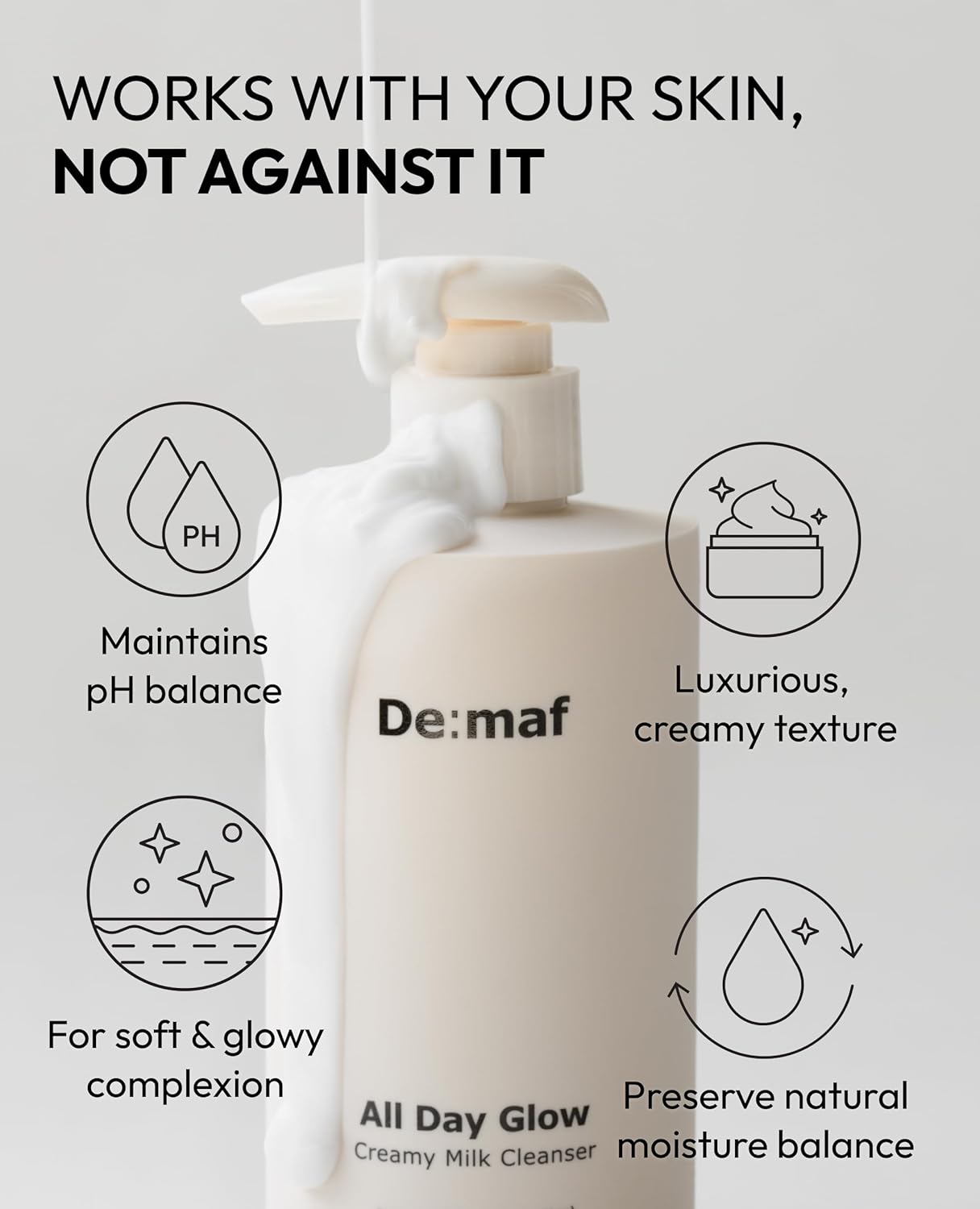 - Gentle Cleansing Action: The Demaf Creamy Milk Cleanser skillfully removes makeup and excess oil without compromising your skin's natural moisture balance.